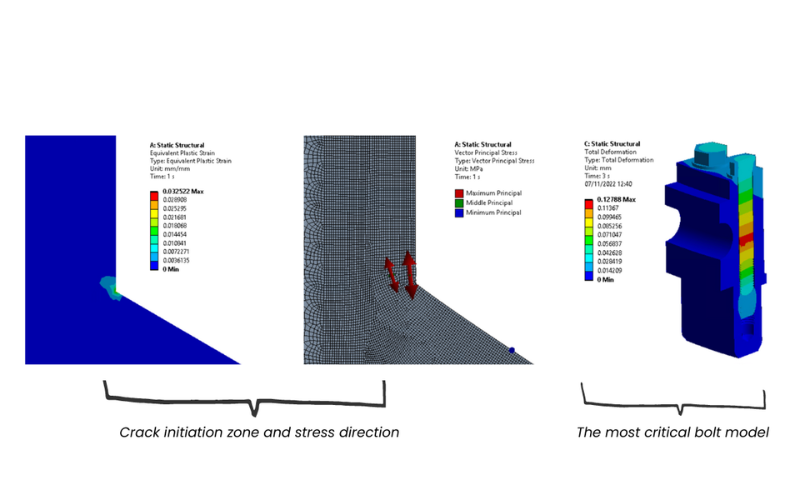 Zona de iniciación de la grieta y dirección de la tensión | El perno más crítico