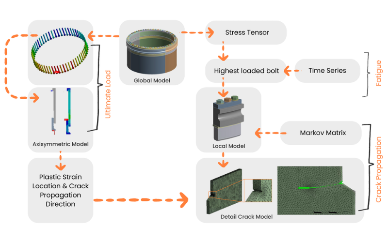 A partir de estas simulaciones, se obtiene el modelo detallado de la propagación de grieta, del que se obtiene la extensión de la longitud de la grieta, así como los mecanismos de fallo (colapso plástico, fractura frágil o plastificación de la sección de la grieta) y el tiempo hasta el fallo.