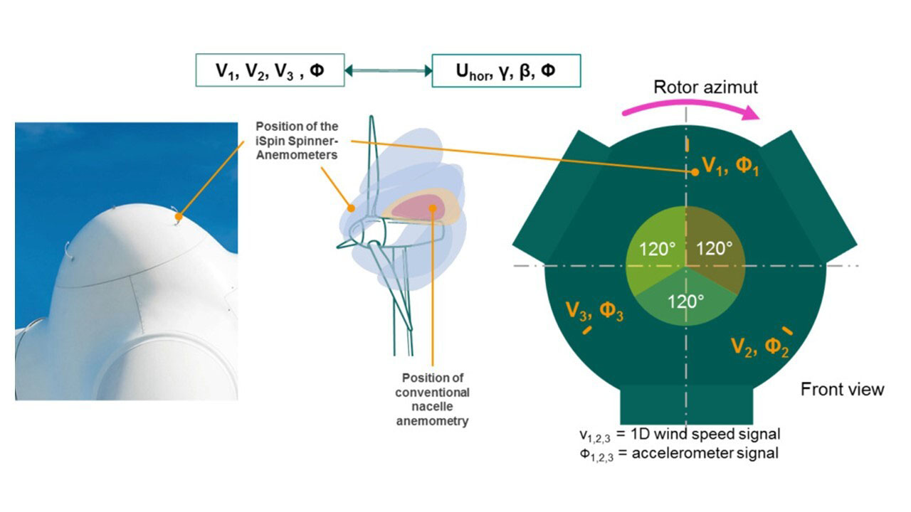 El anemómetro iSpin de Nabla Wind Hub mide el viento en el spinner situado delante de las palas del rotor del aerogenerador, donde las condiciones del flujo son más estables y fáciles de comprender. En comparación con la medición de la velocidad del viento libre en un Met Mast, que se encuentra a 2-4 diámetros de distancia, la medición delante del aerogenerador sólo se ve afectada por la forma del spinner y una reducción de la velocidad del viento por el propio rotor, lo que se conoce como efecto de inducción. Ambos efectos pueden corregirse fácilmente utilizando los parámetros de calibración adecuados.